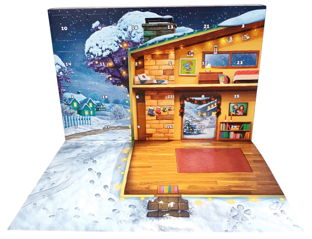 このアドベントカレンダーはね、ペイズリーとオリーの小さいころのクリスマスの思い出がテーマになっているの。だから、真ん中に描かれたお部屋の様子や家族の姿には、にぎやかさの中にもどこか懐かしくて、心がふんわりあたたまるような雰囲気があるのよ。