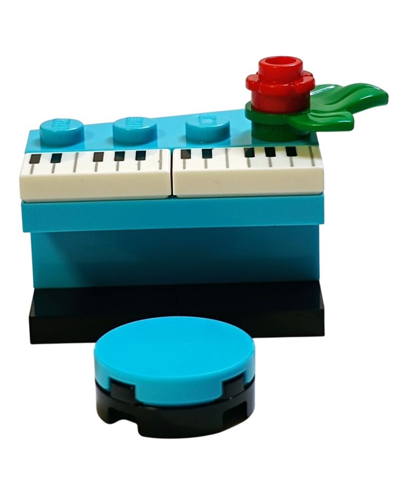 組み立てるとね、水色のミニピアノが完成するの。上に赤いお花が飾られていて、それがとってもすてきなのよ。