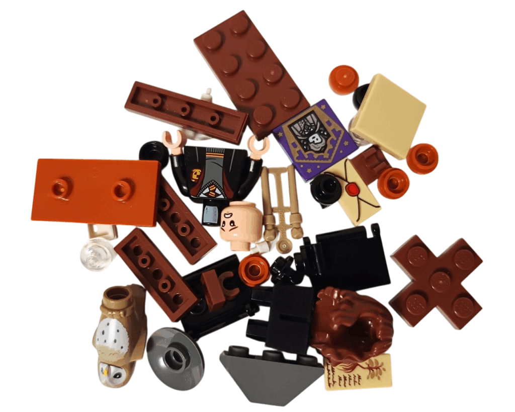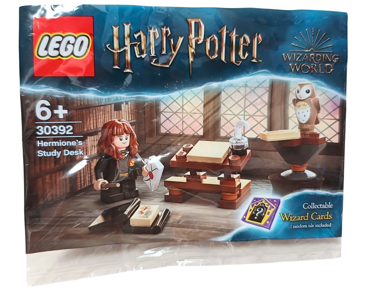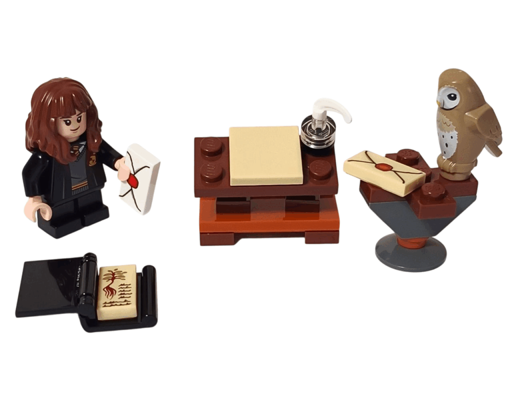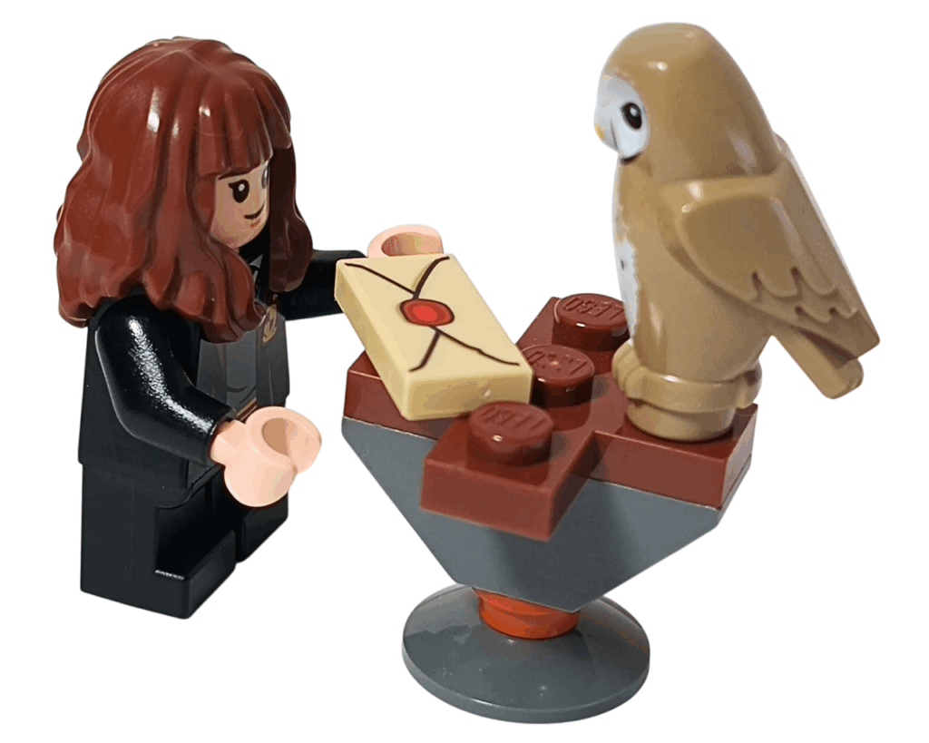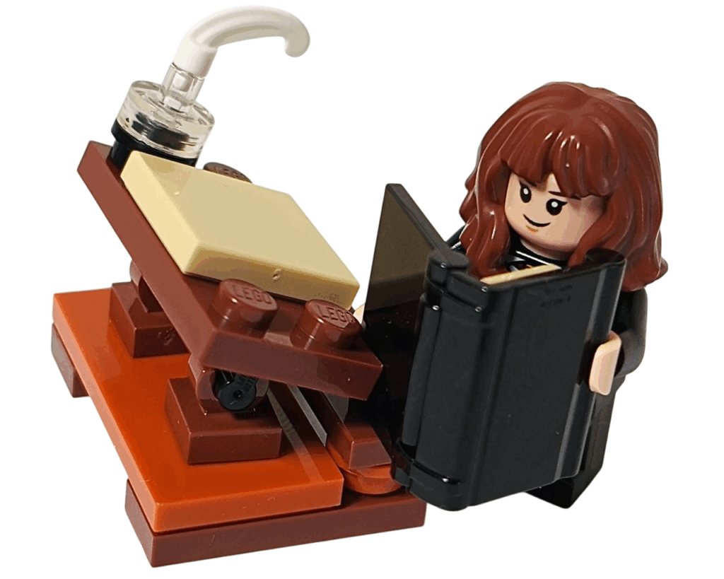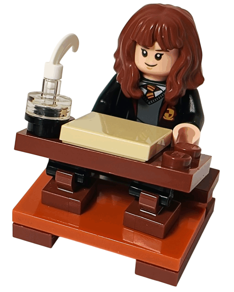 セットには、ハーマイオニーのミニフィグに、勉強机や羽ペン、それに読みかけの本やフクロウまでそろっていて、彼女の真面目で努力家なところがとってもよく表れているのよ📖