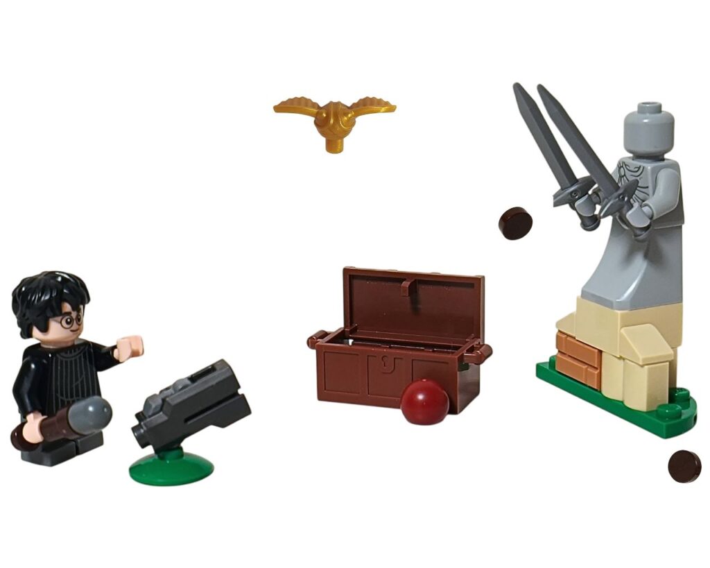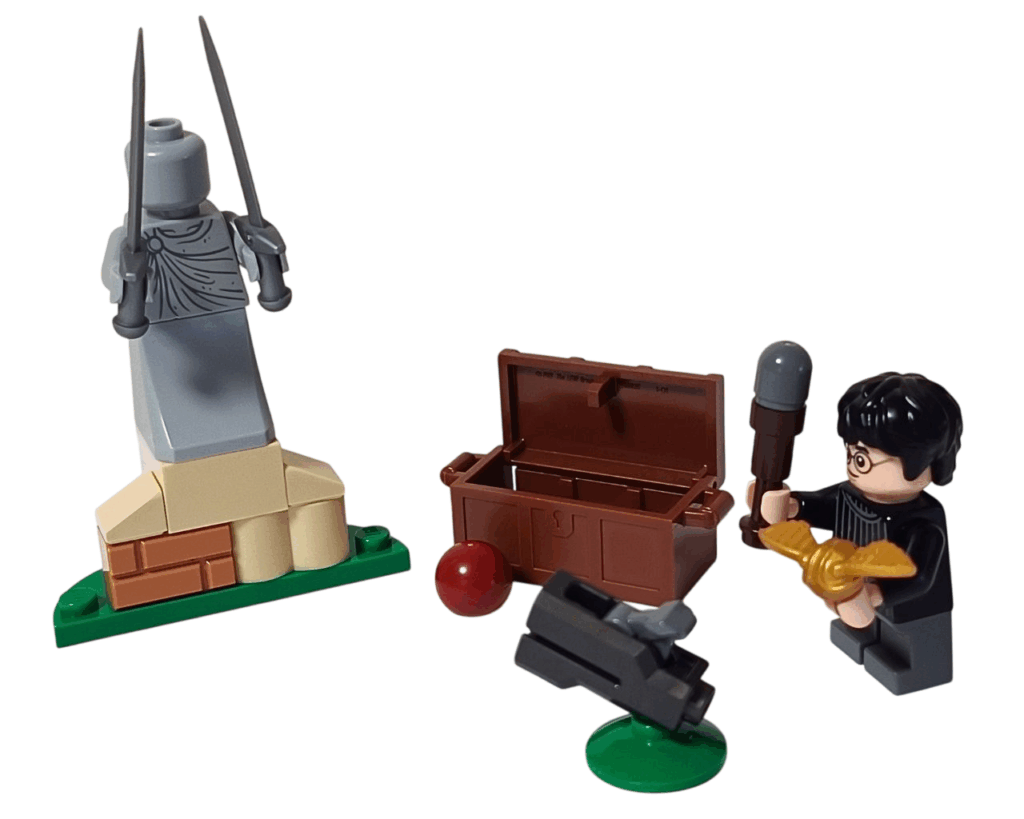 セットには、トレーニング姿のハリーのミニフィグや、ユニークな石像のパーツが入っているの。
